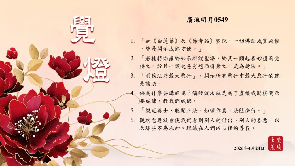 廣海明月0549 覺燈2 (2026/04/24) Post author:大覺晨曦編輯組 Post published:2026/04/24 Post category:覺燈 1.「如《白蓮華》及《諦者品》宣說,一切佛語或實或權,皆是開示成佛方便。」 2.「若補特伽羅於如來所說聖語,於其一類起善妙想而受持之,於其一類起惡劣想而摒棄之,是為謗法。」 3.「明謗法乃最大惡行」,開示所有惡行中最大惡行的就是謗法。 4.佛為什麼要講經呢?講經說法就是為了直接或間接開示要成佛,教我們成佛。 5.「親近善士、聽聞正法、如理作意、法隨法行。」 6.觀功念恩就會使我們看到別人的付出、別人的善意,以及那些不為人知、埋藏在人們內心裡的善良。 累計閱覽數: 37 Read more articles Previous Post廣海明月0549 覺燈1 (2026/04/23)