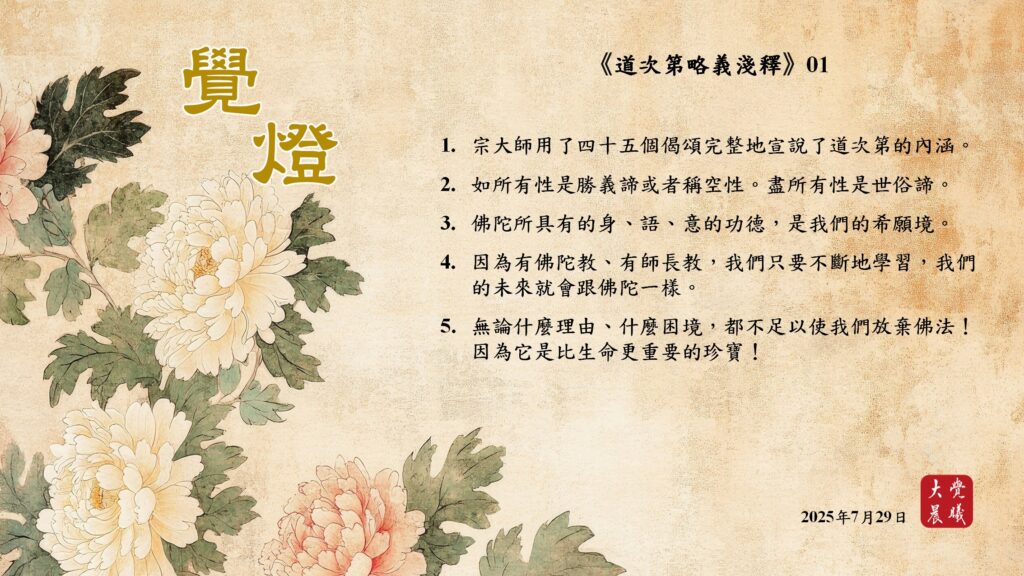 道次第略義淺釋01 覺燈2 (2025/07/29) Post author:大覺晨曦編輯組 Post published:2025/07/30 Post category:覺燈 1. 宗大師用了四十五個偈頌完整地宣說了道次第的內涵。2. 如所有性是勝義諦或者稱空性。盡所有性是世俗諦。3. 佛陀所具有的身、語、意的功德,是我們的希願境。4. 因為有佛陀教、有師長教,我們只要不斷地學習,我們的未來就會跟佛陀一樣。5. 無論什麼理由、什麼困境,都不足以使我們放棄佛法!因為它是比生命更重要的珍寶! 累計閱覽數: 389 Read more articles Previous Post道次第略義淺釋01 覺燈1 (2025/07/28) Next Post道次第略義淺釋02 覺燈1 (2025/07/30)