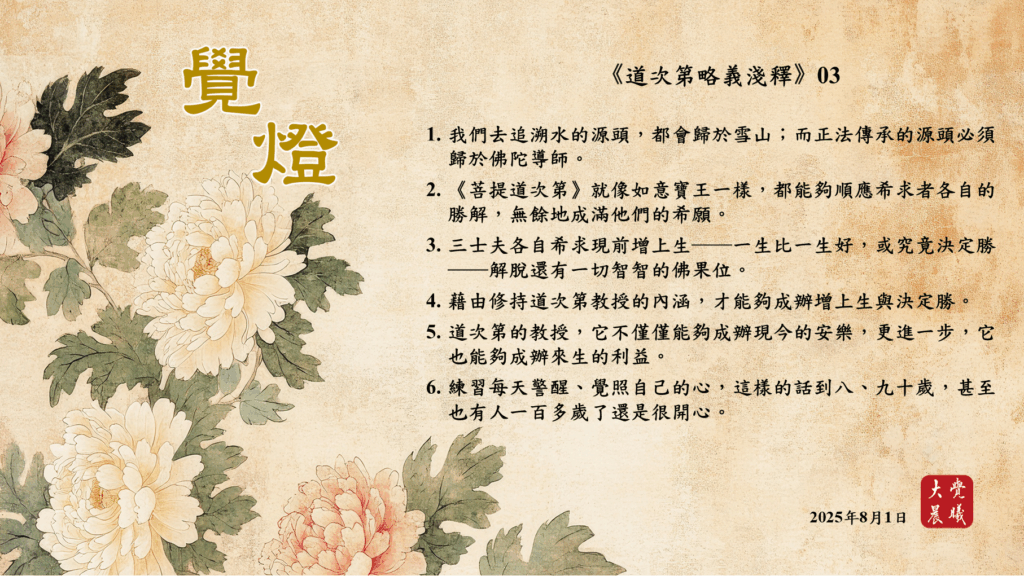 道次第略義淺釋03 覺燈1 (2025/08/01) Post author:大覺晨曦編輯組 Post published:2025/08/02 Post category:覺燈 1. 我們去追溯水的源頭,都會歸於雪山;而正法傳承的源頭必須歸於佛陀導師。2. 《菩提道次第》就像如意寶王一樣,都能夠順應希求者各自的勝解,無餘地成滿他們的希願。3. 三士夫各自希求現前增上生——一生比一生好,或究竟決定勝——解脫還有一切智智的佛果位。4. 藉由修持道次第教授的內涵,才能夠成辦增上生與決定勝。5. 道次第的教授,它不僅僅能夠成辦現今的安樂,更進一步,它也能夠成辦來生的利益。6. 練習每天警醒、覺照自己的心,這樣的話到八、九十歲,甚至也有人一百多歲了還是很開心。 累計閱覽數: 414 Read more articles Previous Post道次第略義淺釋02 覺燈2 (2025/07/31) Next Post道次第略義淺釋03 覺燈2 (2025/08/02)