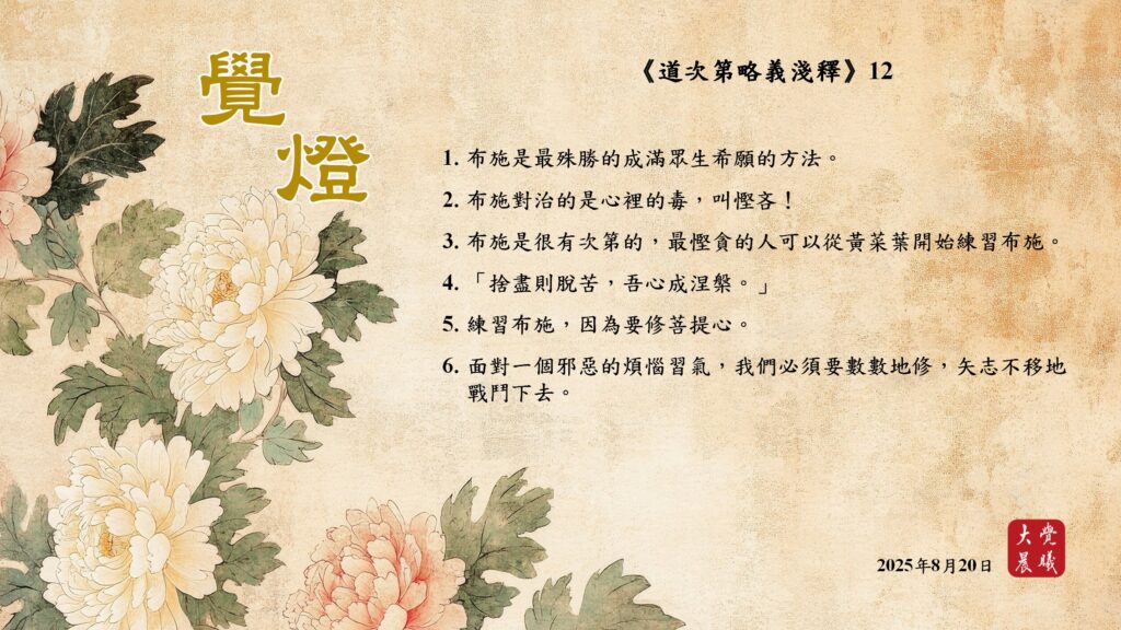 道次第略義淺釋12 覺燈 (2025/08/20) Post author:大覺晨曦編輯組 Post published:2025/08/21 Post category:覺燈 1. 布施是最殊勝的成滿眾生希願的方法。2. 布施對治的是心裡的毒,叫慳吝!3. 布施是很有次第的,最慳貪的人可以從黃菜葉開始練習布施。4. 「捨盡則脫苦,吾心成涅槃。」5. 練習布施,因為要修菩提心。6. 面對一個邪惡的煩惱習氣,我們必須要數數地修,矢志不移地戰鬥下去。 累計閱覽數: 310 Read more articles Previous Post道次第略義淺釋11 覺燈 (2025/08/19) Next Post廣海明月0517 覺燈1 (2025/08/21)