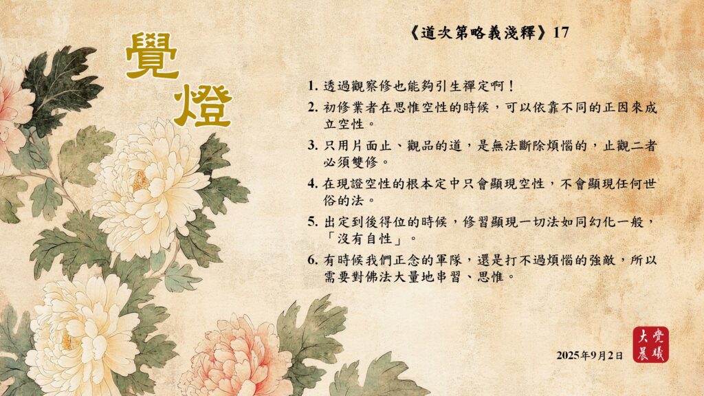 道次第略義淺釋17 覺燈 (2025/09/02) Post author:大覺晨曦編輯組 Post published:2025/09/03 Post category:覺燈 1. 透過觀察修也能夠引生禪定啊!2. 初修業者在思惟空性的時候,可以依靠不同的正因來成立空性。3. 只用片面止、觀品的道,是無法斷除煩惱的,止觀二者必須雙修。4. 在現證空性的根本定中只會顯現空性,不會顯現任何世俗的法。5. 出定到後得位的時候,修習顯現一切法如同幻化一般,「沒有自性」。6. 有時候我們正念的軍隊,還是打不過煩惱的強敵,所以需要對佛法大量地串習、思惟。 累計閱覽數: 405 Read more articles Previous Post道次第略義淺釋16 覺燈 (2025/09/01) Next Post道次第略義淺釋18 覺燈 (2025/09/03)